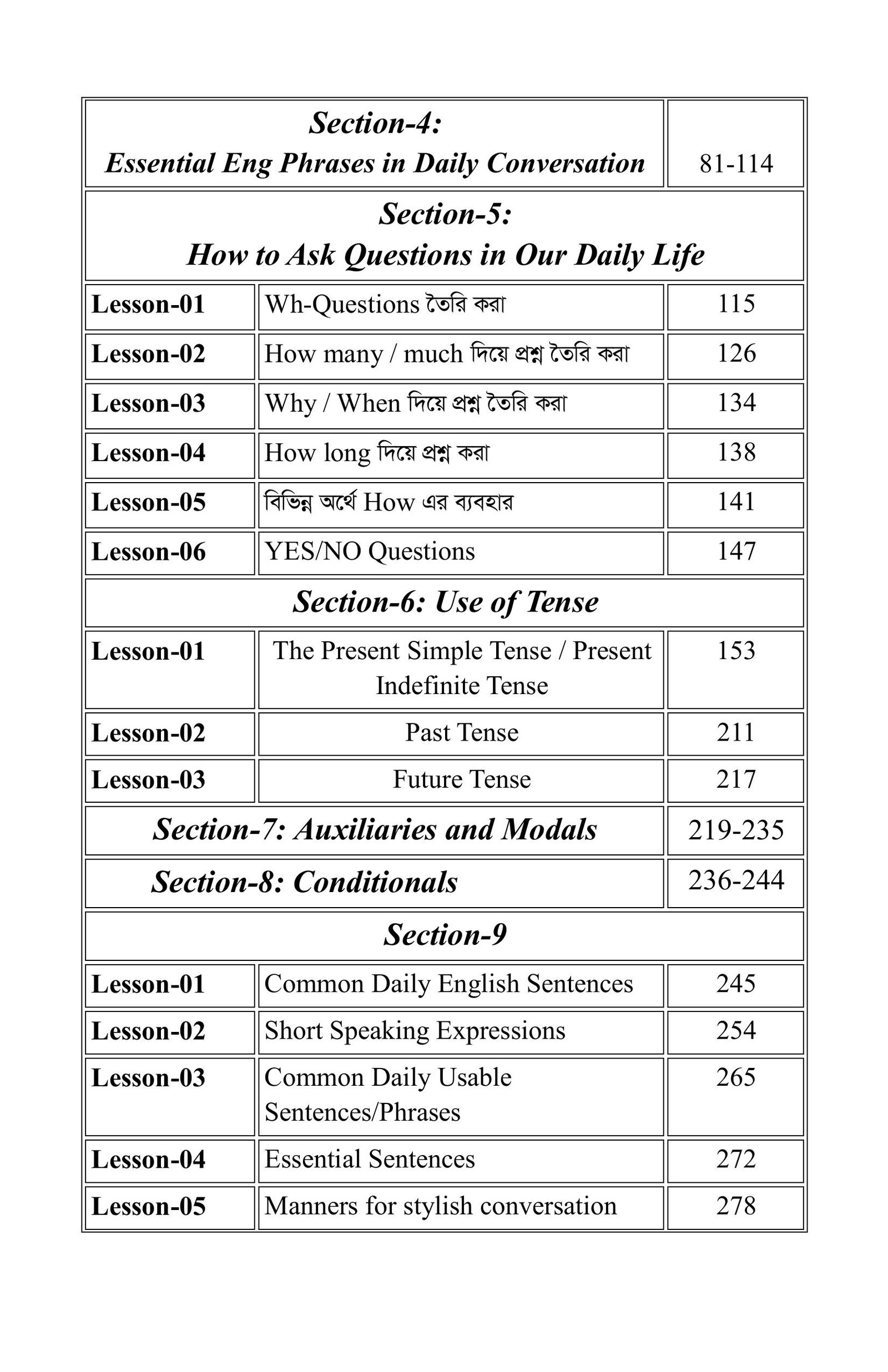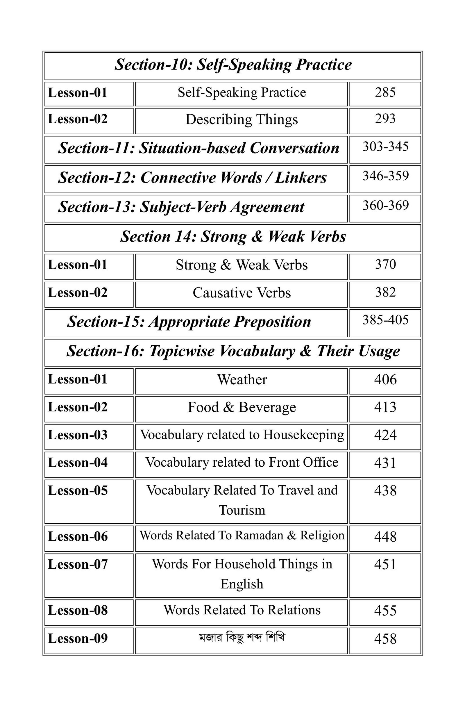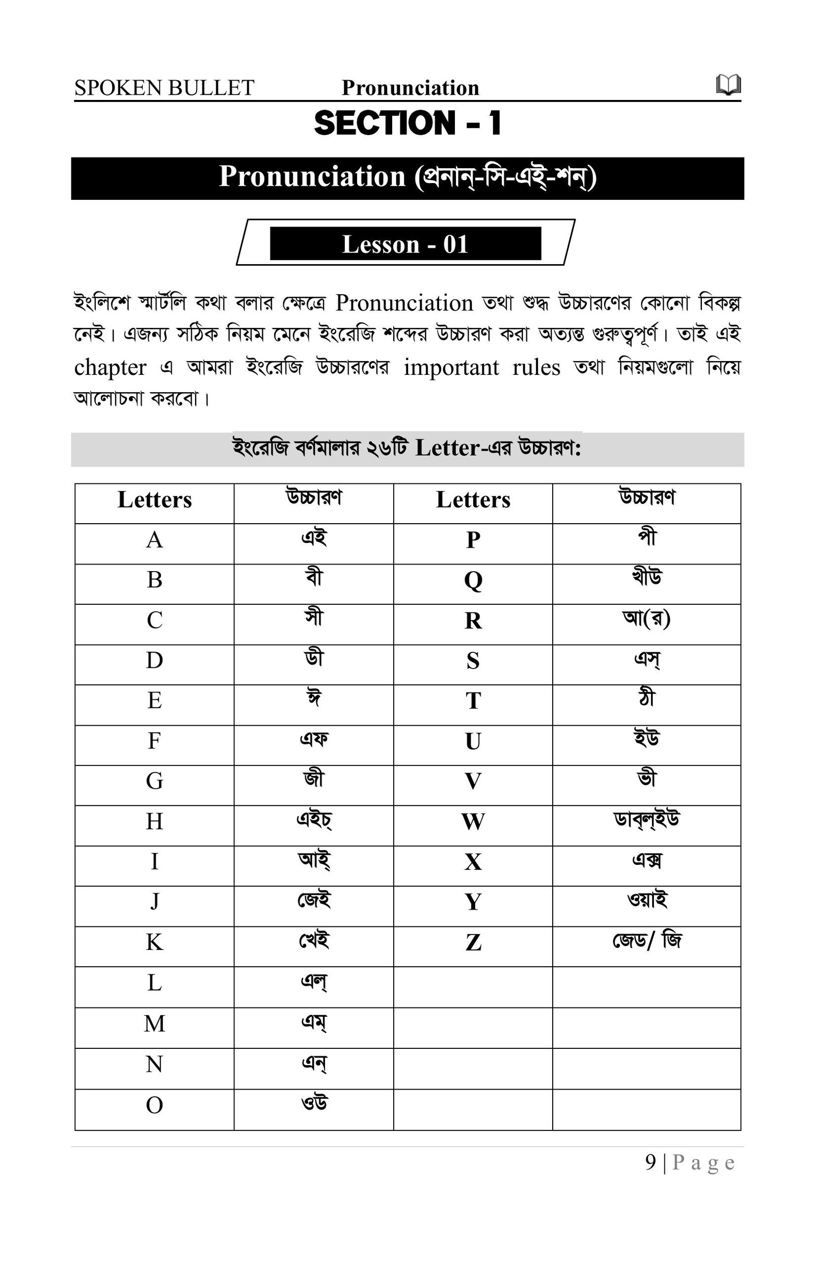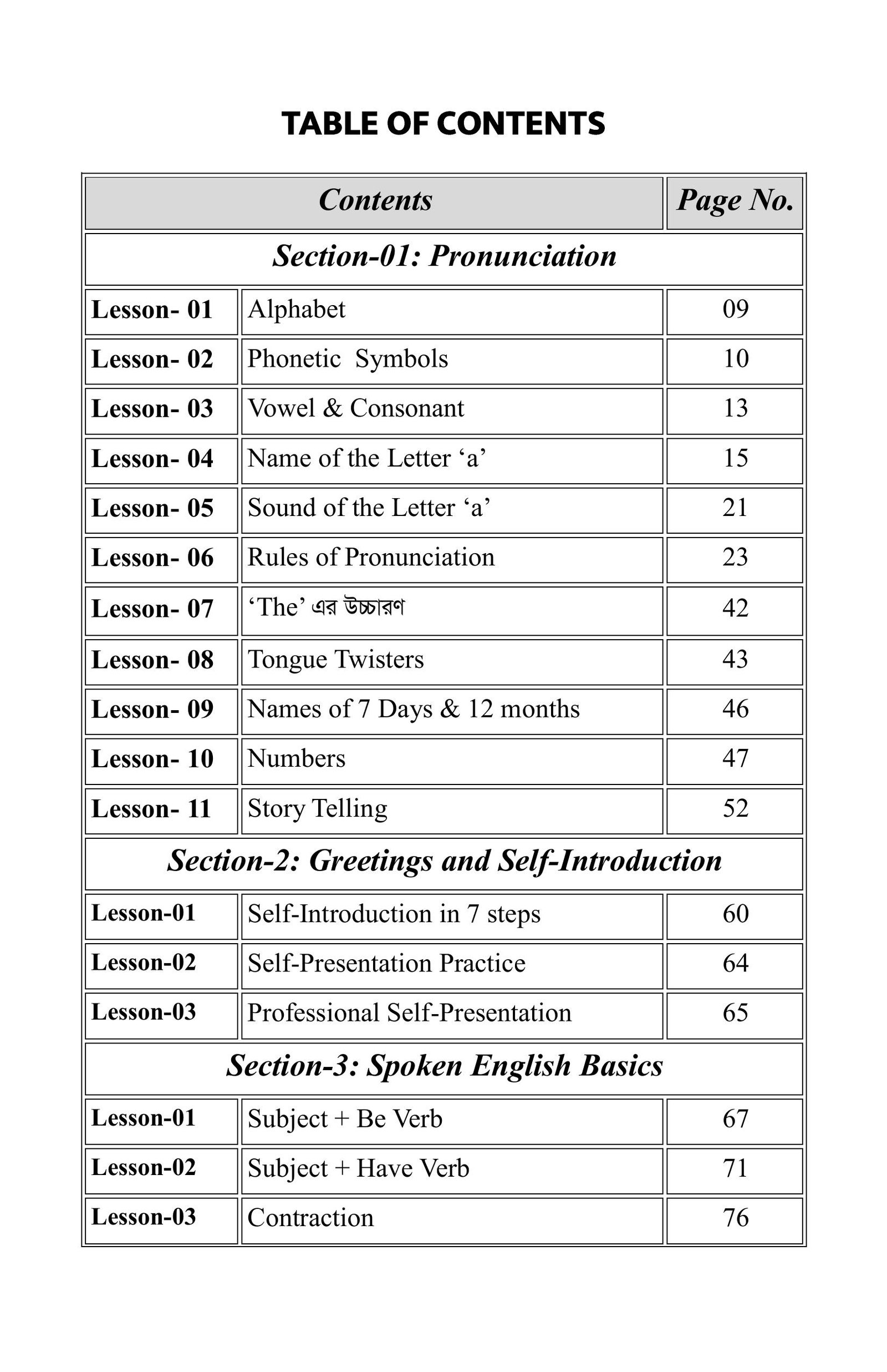 বইটিতে মোট ১৯টি Section রয়েছে। এর শুরুতেই রাখা হয়েছে "Pronunciation" নামক একটি বিশেষ অধ্যায়। আমাদের অধিকাংশ শিক্ষার্থীর জন্য ইংরেজি উচ্চারণ বা "Pronunciation" বিষয়টি একেবারেই নতুন হওয়ায় এ বিষয়ে ভীতি কাজ করে। এ বিষয়টি বিবেচনা করেই ইংরেজি ভাষার শুদ্ধ উচ্চারণের নিয়মগুলোকে একেবারে Beginner Level থেকে সহজ ও সাবলীলভাবে অসংখ্য উদাহরণের মাধ্যমে বিশদভাবে ব্যাখ্যা করা হয়েছে। এর পাশাপাশি "Pronunciation" বিষয়ক আমার ভিডিও লেসনও যুক্ত করা হয়েছে। যদি কোনো শিক্ষার্থী এই অধ্যায়ের প্রতিটি অংশ মনোযোগ দিয়ে পড়ে, ভিডিও লেসনগুলো নিয়মিত দেখে ও চর্চা করে, তবে তার ইংরেজি উচ্চারণ শুদ্ধ করার ক্ষেত্রে এক নতুন দুয়ার উন্মুক্ত হবে- ইনশাআল্লাহ।