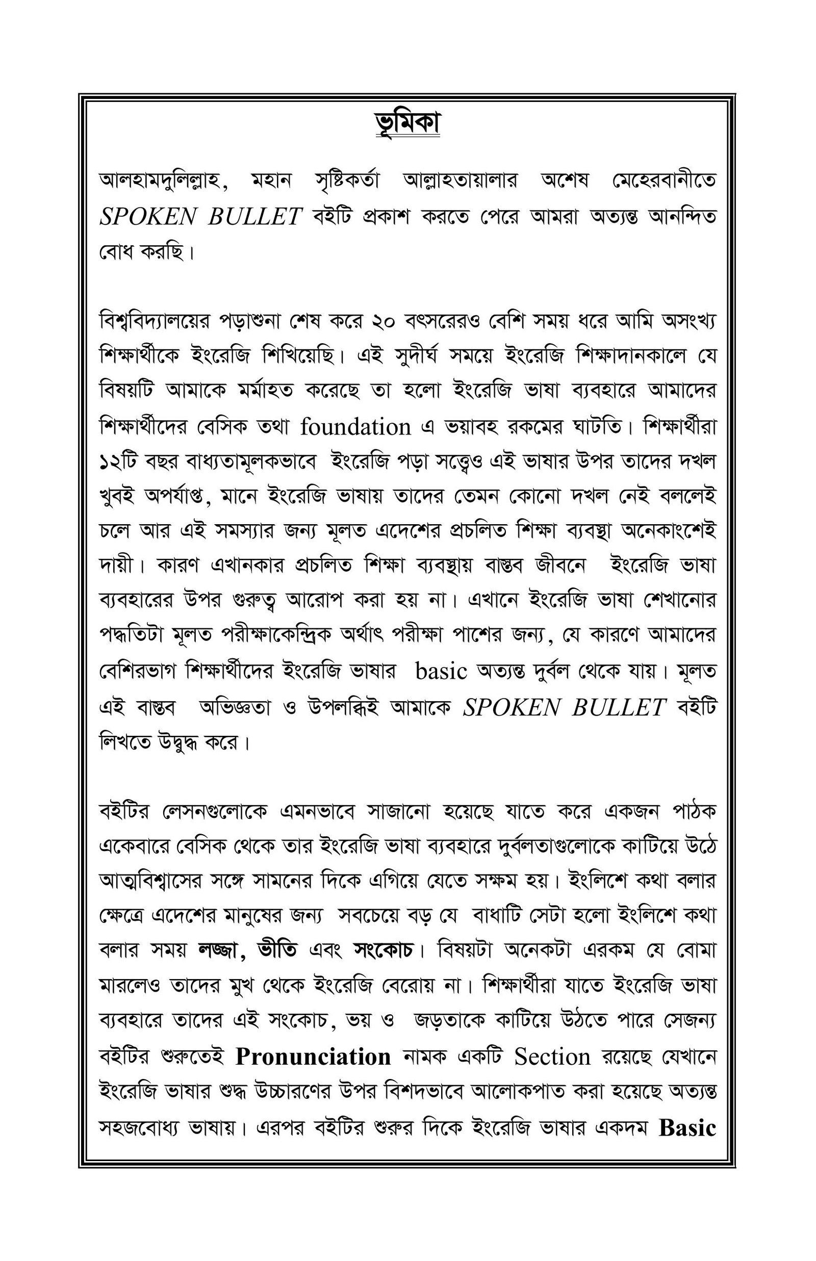 আত্মবিশ্বাসের সাথে সাবলীল ইংরেজি বলার এই যাত্রায় আপনাকে জানাই আন্তরিক স্বাগতম। "SPOKEN BULLET" বইটি বিশেষভাবে সাজানো হয়েছে যাতে আপনি বেসিক থেকে শুরু করে ধাপে ধাপে ভাষাগত দুর্বলতা কাটিয়ে উঠতে পারেন এবং দৈনন্দিন জীবনে সাবলীল ও স্বতঃস্ফূর্তভাবে ইংরেজি বলার প্রয়োজনীয় দক্ষতা অর্জন করতে পারেন।