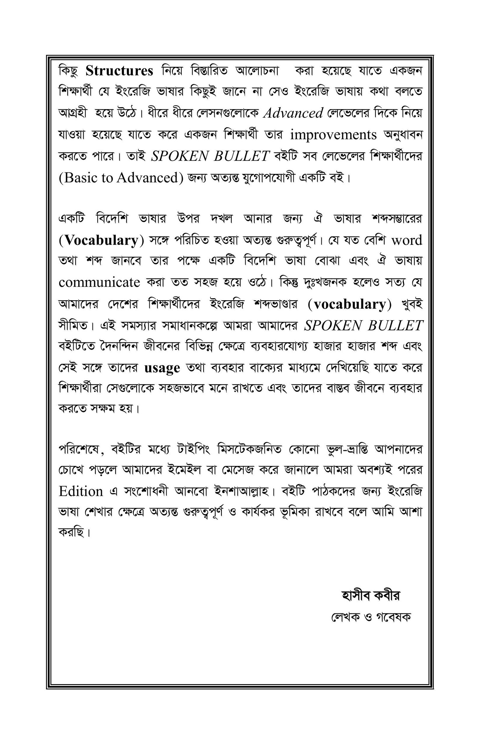 ইংরেজি ভাষা শিক্ষার প্রচলিত বইগুলো থেকে ভিন্নধর্মী এই বইটিতে আমি গ্রামারের মৌলিক বিষয়গুলো যেমন: Tense, Auxiliaries and Modals, Conditionals সহ আরও অনেক গুরুত্বপূর্ণ বিষয় সহজভাবে এবং বাস্তব প্রয়োগের ভিত্তিতে উপস্থাপন করার চেষ্টা করেছি। এর ফলে একজন শিক্ষার্থী শুধু সাবলীলভাবে Fluent English-এ কথাই বলতে পারবে না, বরং শুদ্ধভাবে ইংরেজিতে লিখতেও পারবে।